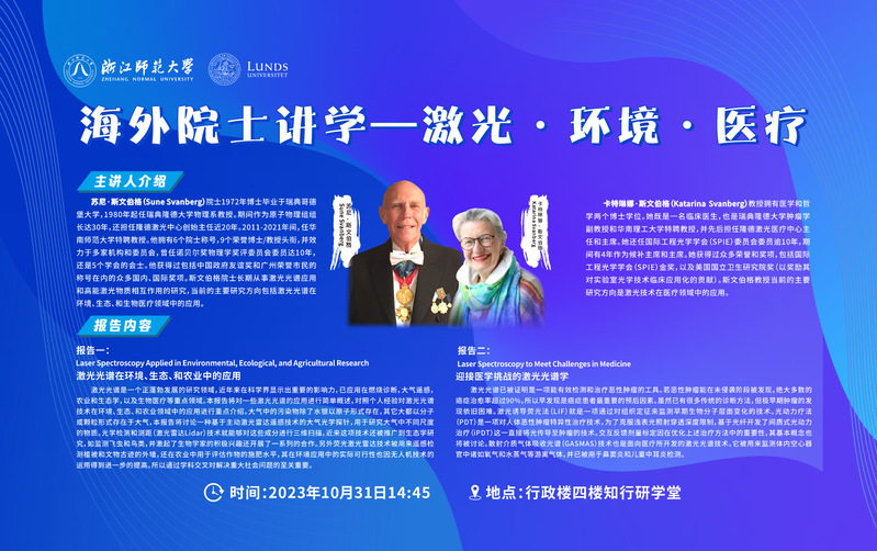 10月31日,瑞典隆德大学院士苏尼·斯文伯格院士及夫人卡特琳娜·斯文伯格教授受邀请访问杭州高等研究院,并围绕“激光·环境·医疗”为主题为浙江师范大学杭州校区师生带来了两场精彩的学术报告。